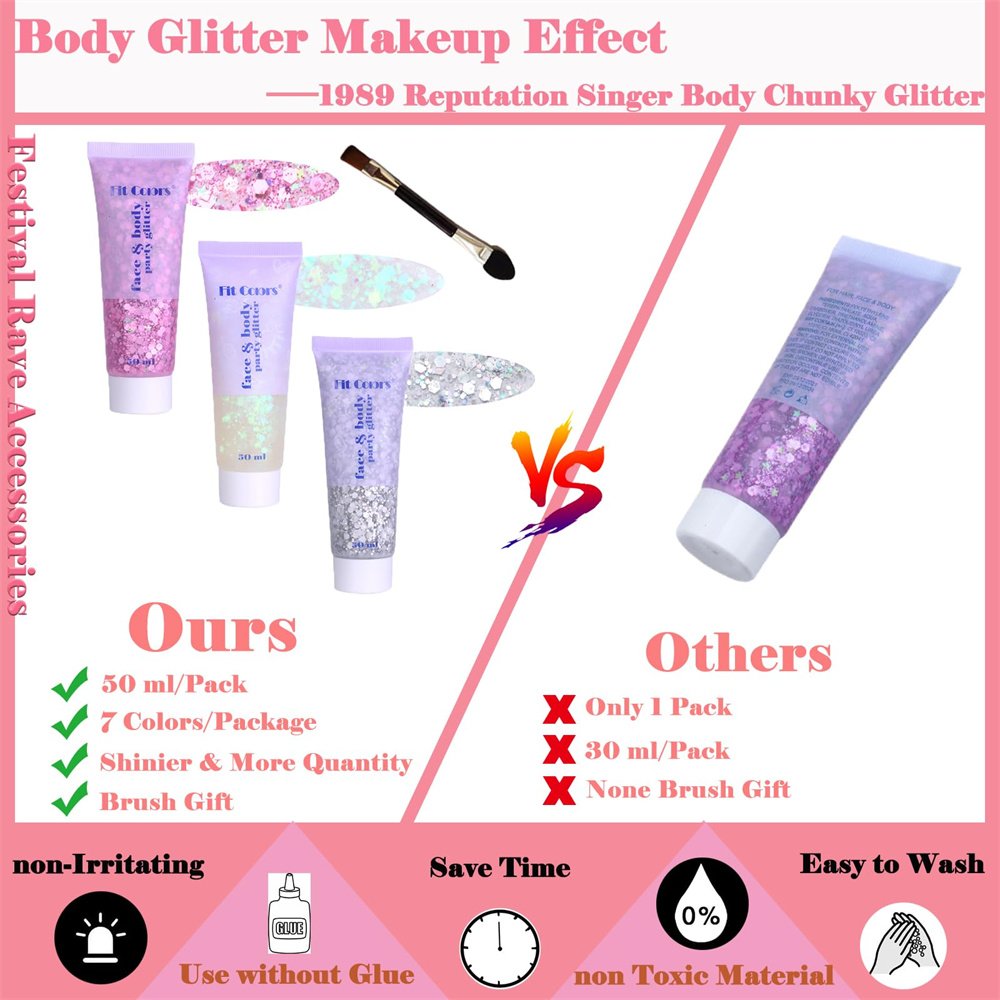 3.Effortless Application and Removal: Our glitter gel eliminates the need for glue. Apply directly to hair and body using fingertips or the included brush, saving time on makeup. It dries quickly and lasts all day. Easily wash off the glitter with water and soap when you're ready to remove it.