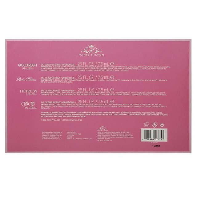 Paris Hilton Eau de Parfum Coffret Perfume Gift Set for women offers you the unique opportunity to sample four top selling Paris Hilton fragrances. This set contains mini replica bottles of Paris Hilton original, Gold Rush for women, Can Can, and Heiress in a convenient travel size of 0.25 oz sprays. Perfect sampling opportunity, travel fragrance, gift giving, or building your own fragrance wardrobe.